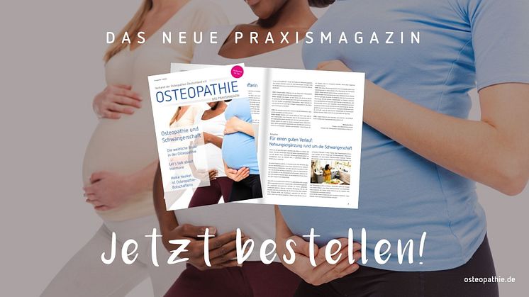 „Osteopathie während und nach der Schwangerschaft“ ist das Schwerpunktthema der neuen Ausgabe von „Osteopathie – das Praxismagazin“. In den zahlreichen Beiträgen und Interviews geht es außerdem unter anderem ums Stillen, die weibliche Brust in der Osteopathie, Hormone, Nahrungsergänzung, Yoga und Bauchtanz für Schwangere. Auch Forschungsergebnisse und ein Buchtipp warten auf die Patientinnen. Mitglieder des Verbandes der Osteopathen Deutschland (VOD) e.V. können die mittlerweile 10. Ausgabe des Magazins im internen Bereich der Internetseite www.osteopathie.de betrachten und online bestellen. Informationen dazu gibt es telefonisch unter der Nummer 0611/5808975-0.